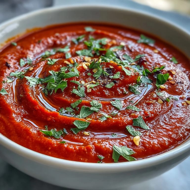 Save There's something almost magical about the moment when roasted red peppers transform from charred, blistered skins into silky sweetness. I discovered this soup on a grey afternoon when my kitchen smelled like caramelized garlic and I had four perfect peppers sitting on the counter, practically begging to be roasted. What started as an experiment with what I had on hand became the dish I now make whenever I need warmth, color, and that perfect balance of sweet pepper against a spicy harissa kick.