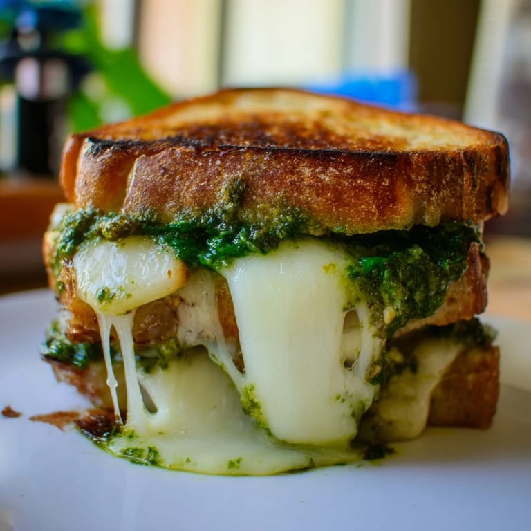 Save The smell of garlic and toasted pine nuts pulled my roommate out of her room one Wednesday night, and I knew I had stumbled onto something worth keeping. I had made pesto before, sure, but swapping out half the basil for spinach turned the whole thing brighter, grassier, less heavy. When I slathered it onto buttered bread with two kinds of cheese and pressed it all into a hot skillet, the kitchen filled with a smell so good we both just stood there, waiting. That first bite, all crunch and melt and green herby sharpness, made me wonder why I had ever settled for plain grilled cheese.